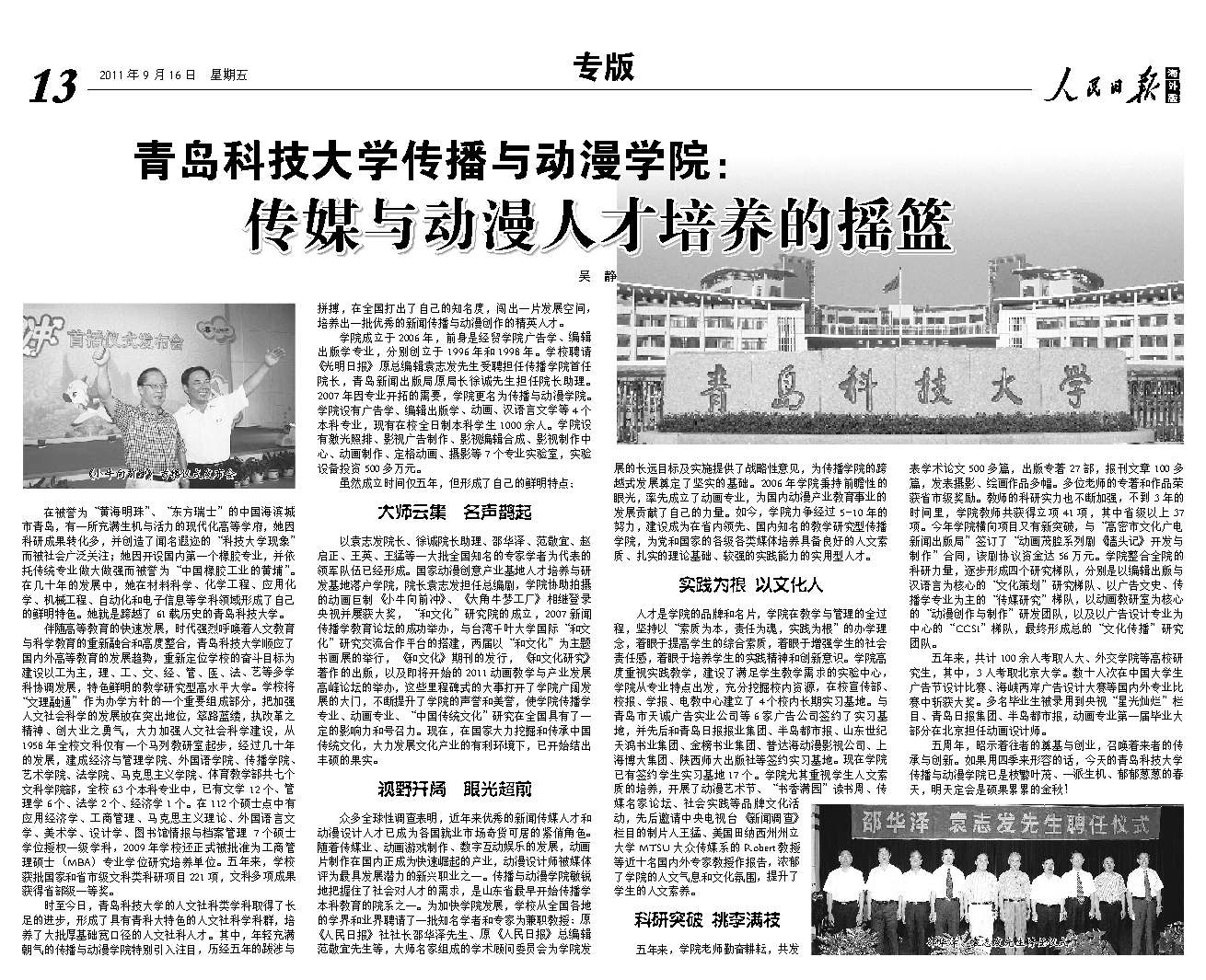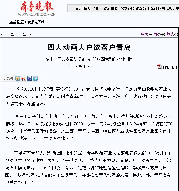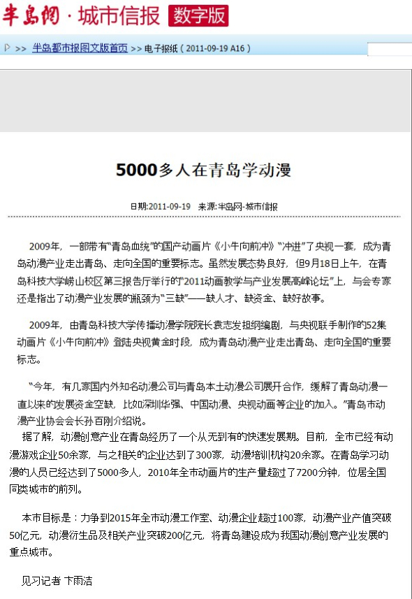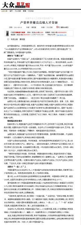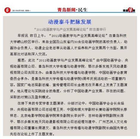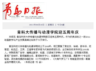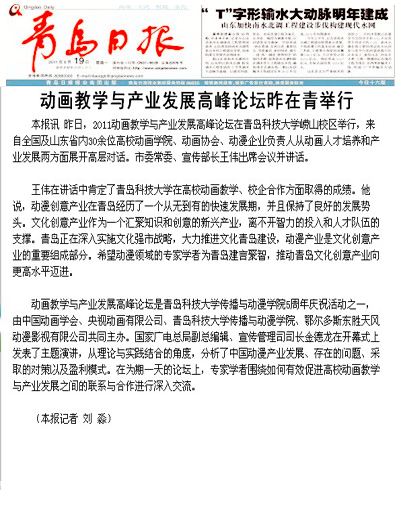 的办学历程、培养特色、发展成就等方面进行了深度采访和整版报道。在举办动画教学与产业发展高峰论坛当天,大众日报、齐鲁晚报、山东电视台、青岛电视台、青岛日报、青岛早报等十余家媒体记者莅校,做了大量采访报道工作,人民网、新华网、中新网、网易、新浪、搜狐等网媒和海外诸多华文媒体也大量转载报道。