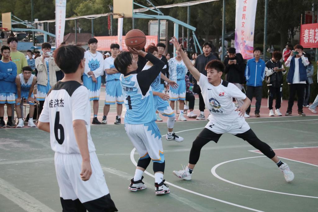 首先开场的是男篮比赛,哨声一响,几经周折,球传到了谷嘉骏手中。篮球少年抬高胳膊,向篮筐奋力投球,身姿矫健,篮球精准命中篮筐的画面引来了众人的欢呼。