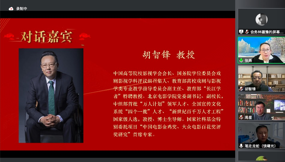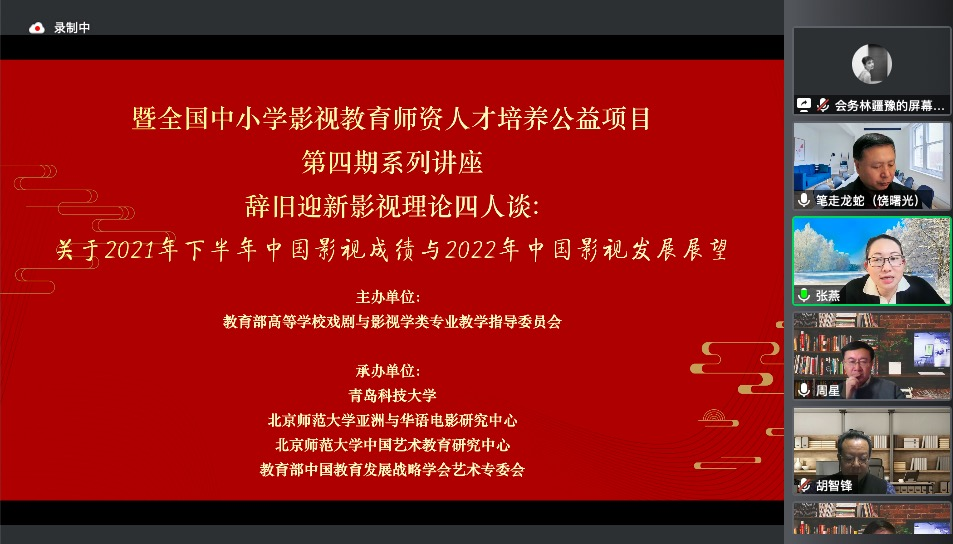 党委副书记胡智锋教授、中国高校影视学会会长丁亚平教授、北京大学陈旭光教授共同就“关于2021年下半年中国影视成绩与2022年中国影视发展展望”一题于云端开展精彩学术论坛。周星教授为本次学术论坛作精彩点评。张燕教授为本次论坛做全程主持,北京师范大学艺术与Netflav