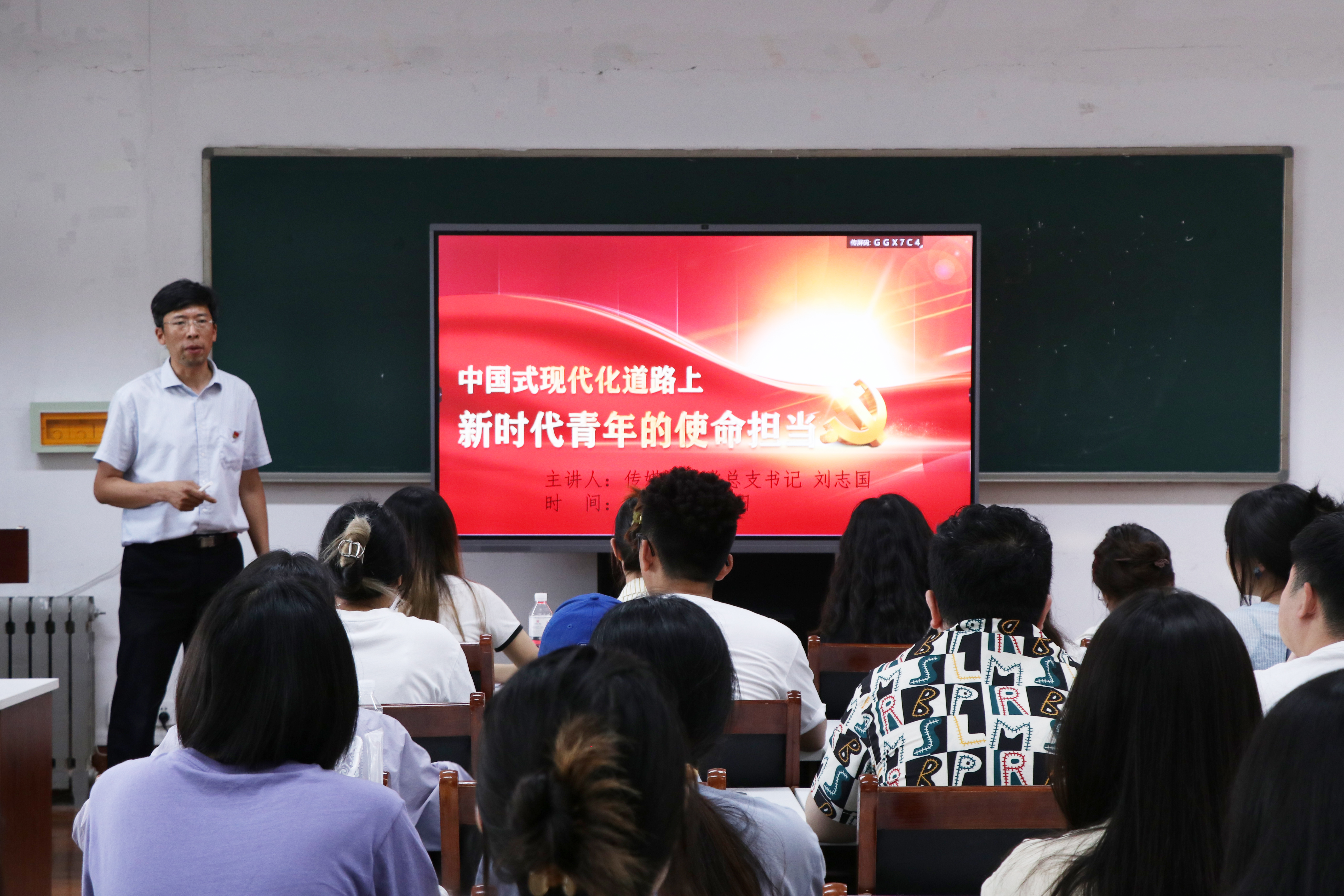 党总支书记刘志国主讲,2023届毕业生党员代表,其他年级党员代表参加活动。
