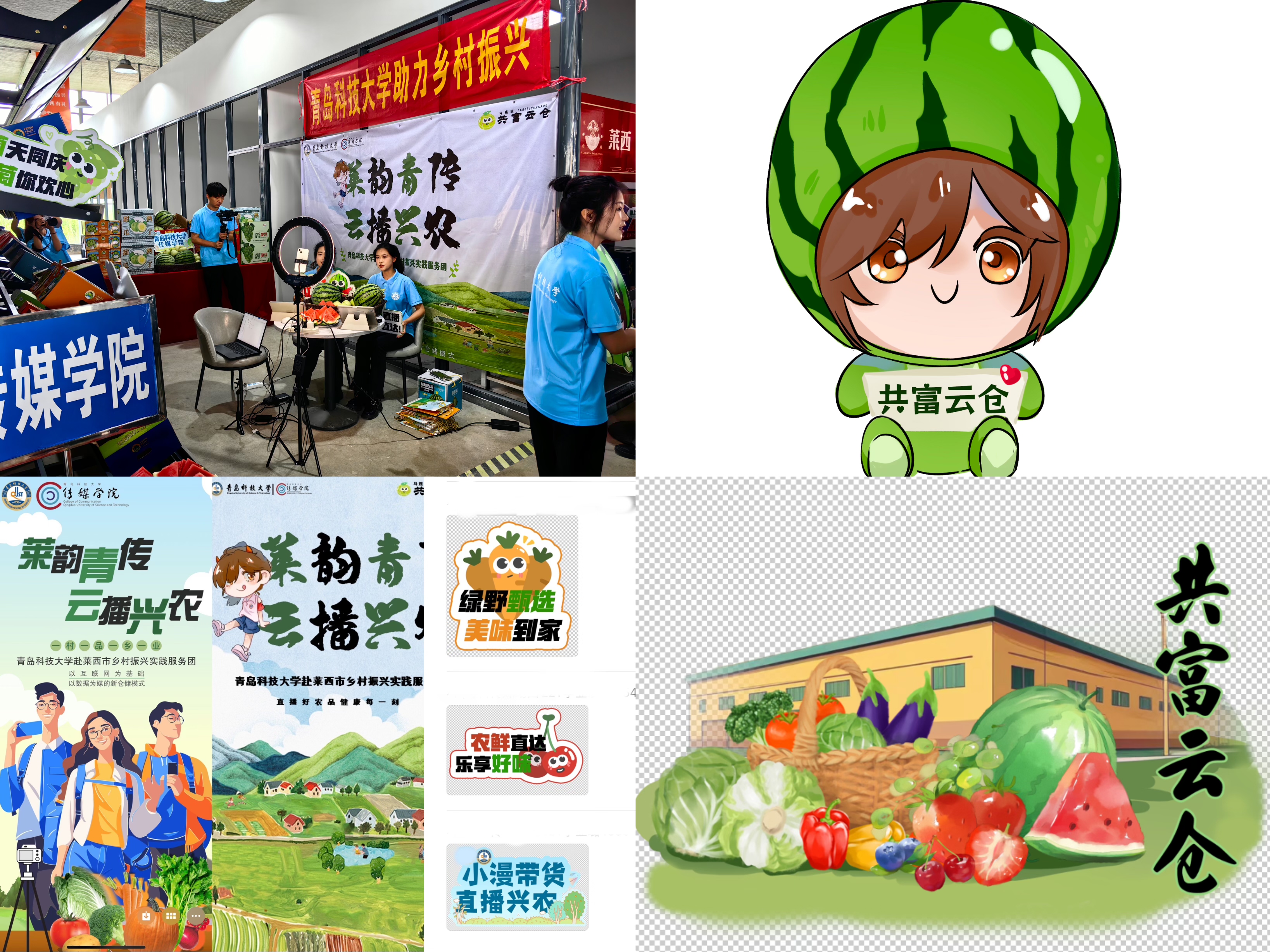 动画专业(国家一流专业)优势,聚焦莱西马连庄的农产品特色和市场需求,充分发挥专业特色并顺应当前数字化营销的趋势,以直播助农及创意设计的方式助力乡村振兴。实践现场,团队对麒麟瓜和马连庄甜瓜进行直播宣传推介,并丰富IP形象设计,创新设计“小漫姐姐”与瓜果融合的卡通形象,量身设计云仓形象与瓜果结合的专属特色标签,以实际行动提升产品辨识度,助力构建莱西农产品品牌新形象。