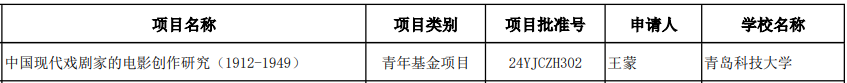 王蒙博士申报的《中国现代戏剧家的电影创作研究(1912-1949)》(项目号:24YJCZH302)获得青年课题立项。