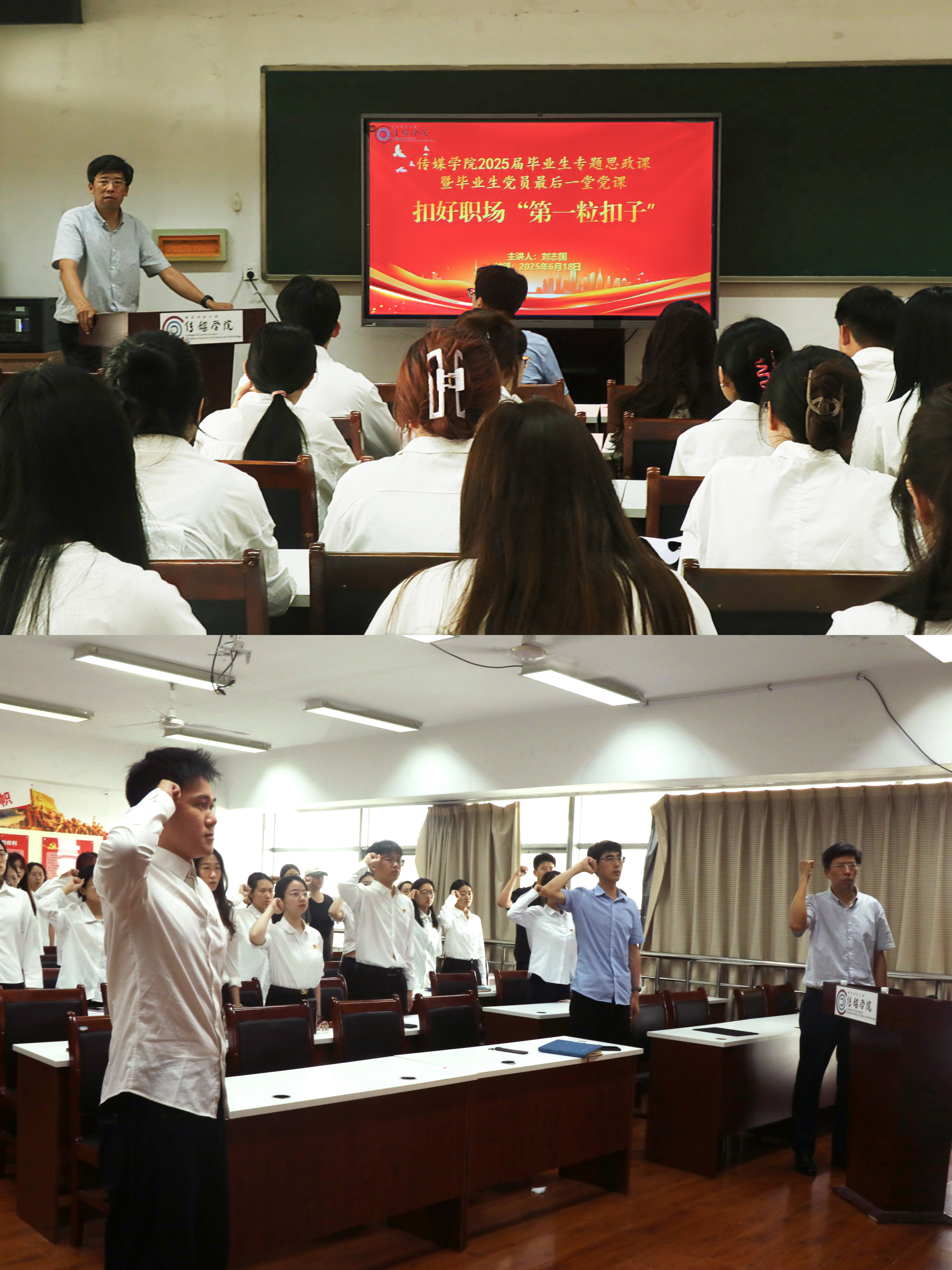 党委书记刘志国以扣好职场“第一粒扣子”为题,为2025届毕业生讲授专题思政课暨毕业生党员最后一堂党课,并带领毕业生党员重温入党誓词,签署《廉洁从业承诺书》。刘志国结合党的二十大报告中关于“党风廉政建设和反腐败斗争永远在路上”等重要论述,结合自身经历及典型案例,深刻剖析当前毕业生面临的职场廉洁风险与挑战,引导毕业生发扬“科大精神”、践行“橡胶品格”、贯彻“五有理念”,切实扣好职场“第一粒扣子”。