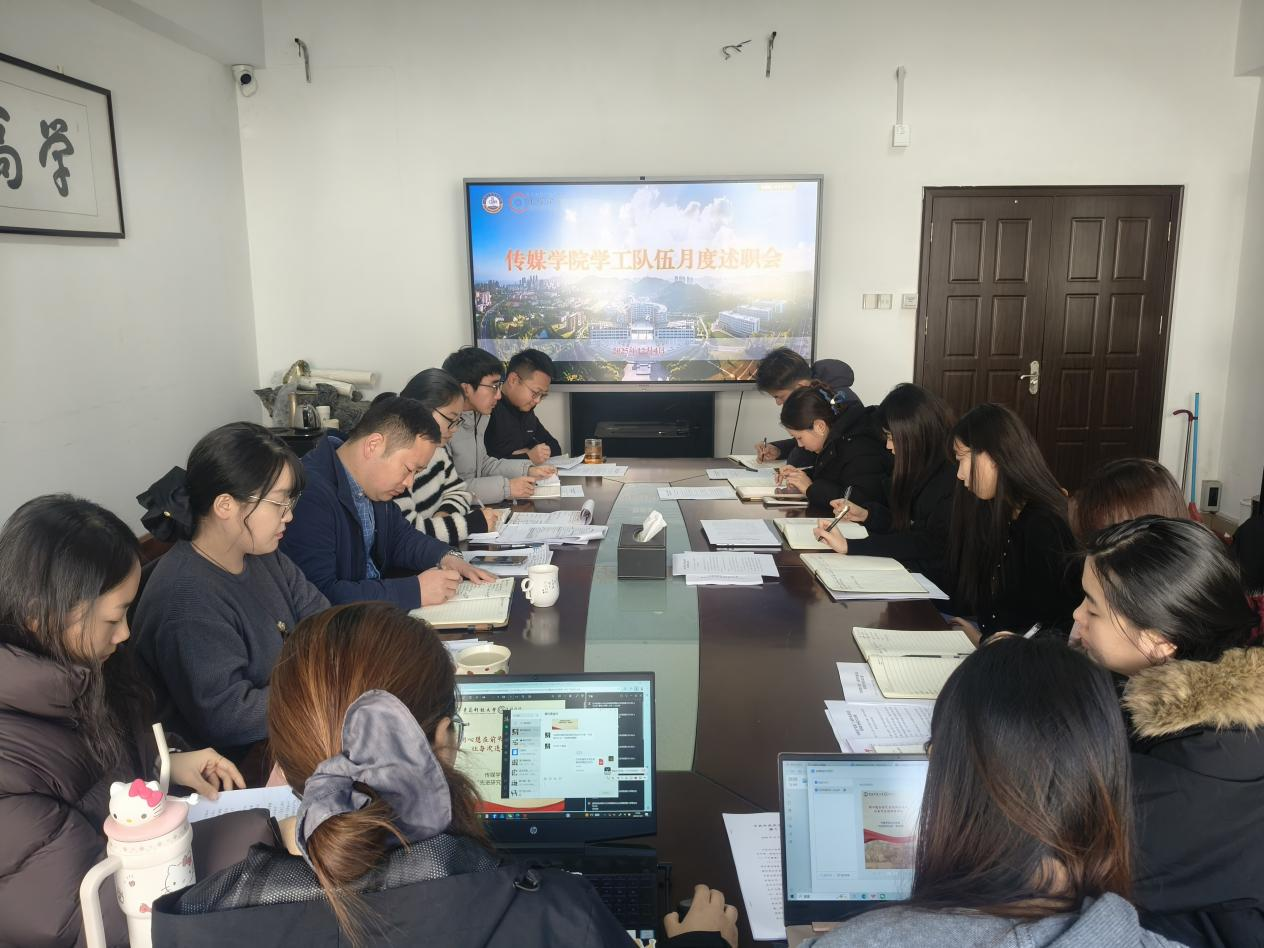 要求和工作实际,他提出三点意见:一是坚持夯实基础与统筹协调相结合。要着力建强班委、舍长等学生骨干队伍,用好各类工作平台与沟通机制,强化日常工作调度与协同联动,不断筑牢学生教育管理服务根基。二是坚持乐学善学与精业笃行相贯通。传媒学工人要始终保持求知若渴的学习状态,干一行、爱一行、专一行,在持续提升专业素养中实现个人成长与事业进步。三是坚持聚焦重点与注重实效相统一。要围绕“学出传媒范 亮出小漫牌”育人品牌建设精准发力,优化方式方法,提升工作质效,确保各项工作落到实处、取得实效,切实提高传媒学工质量。