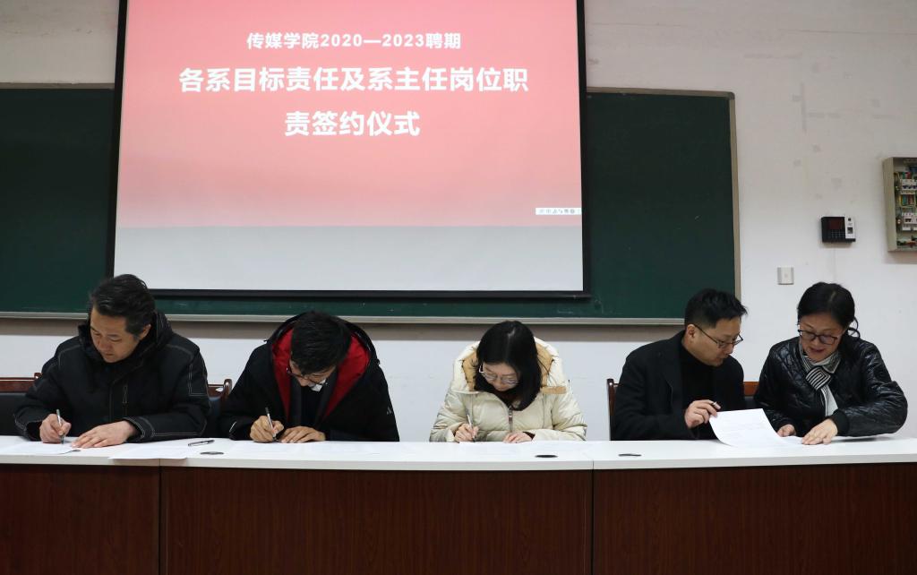 党总支书记刘志国、执行院长杨建华分别同影视与动画系、传播系、广告与影视系、中文系正副系主任签订协议书。