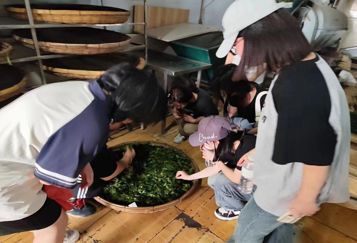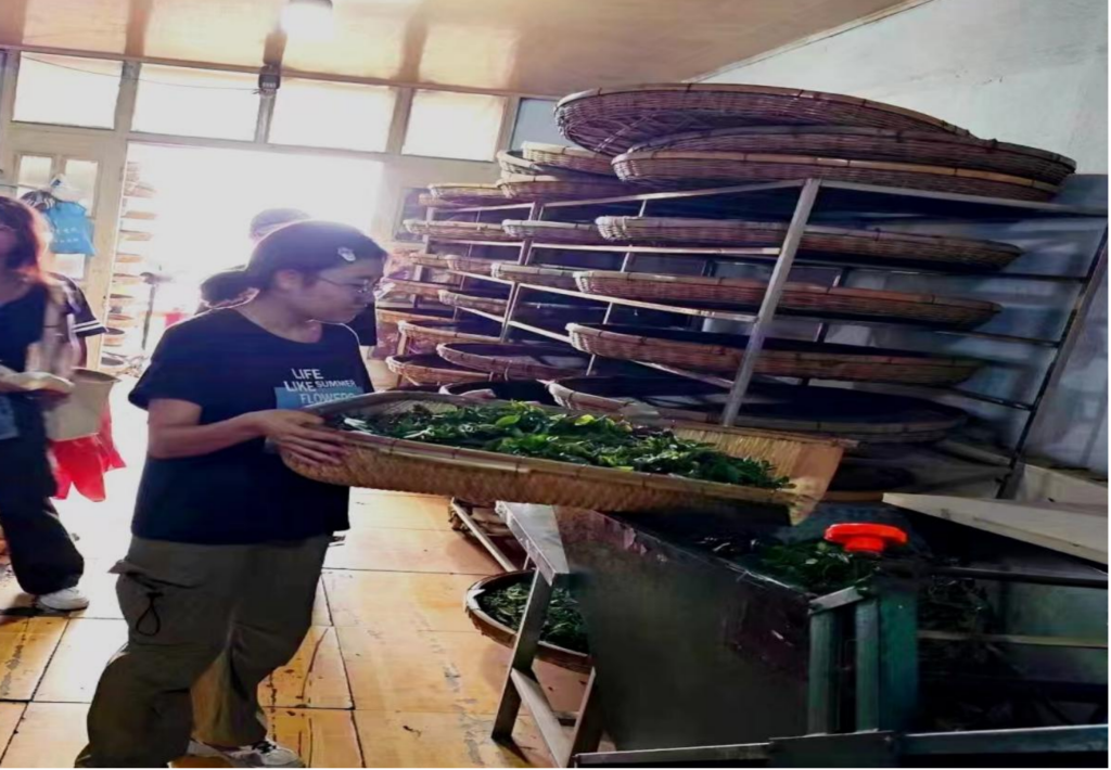 杀青。杀青,杀的是水分和青草气。杀青是绿茶等茶叶加工的第一道工序,通过高温处理破坏茶叶中的酶活性,防止茶叶发酵,同时去除部分水分,使茶叶保持其固有的绿色,便于后续的加工和保存。这一程序就像人发展历史中的18岁,褪去儿童时期的稚嫩,等待着进一步沉淀与发展。团队成员们体验了将茶叶放在机器中,看着机器加工着鲜叶。随着加工的完成,茶叶的香气更加浓郁,沁人心脾、安定舒神。